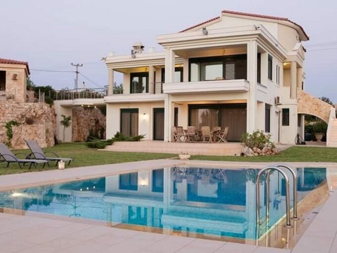 The property, located on the pine-covered hill of Agios Matthaios, offers unobstructed panoramic views of the city and the bay of Chania. It includes sunlit gardens with lawn, ornamental and aromatic plants, fruit and olive trees, a vineyard, organic vegetables, a waterfall with water lilies and fish, a courtyard, a small cave, a 100 sq.m. pool with hydromassage, a playroom, BBQ, an oven, and an automatic irrigation system.